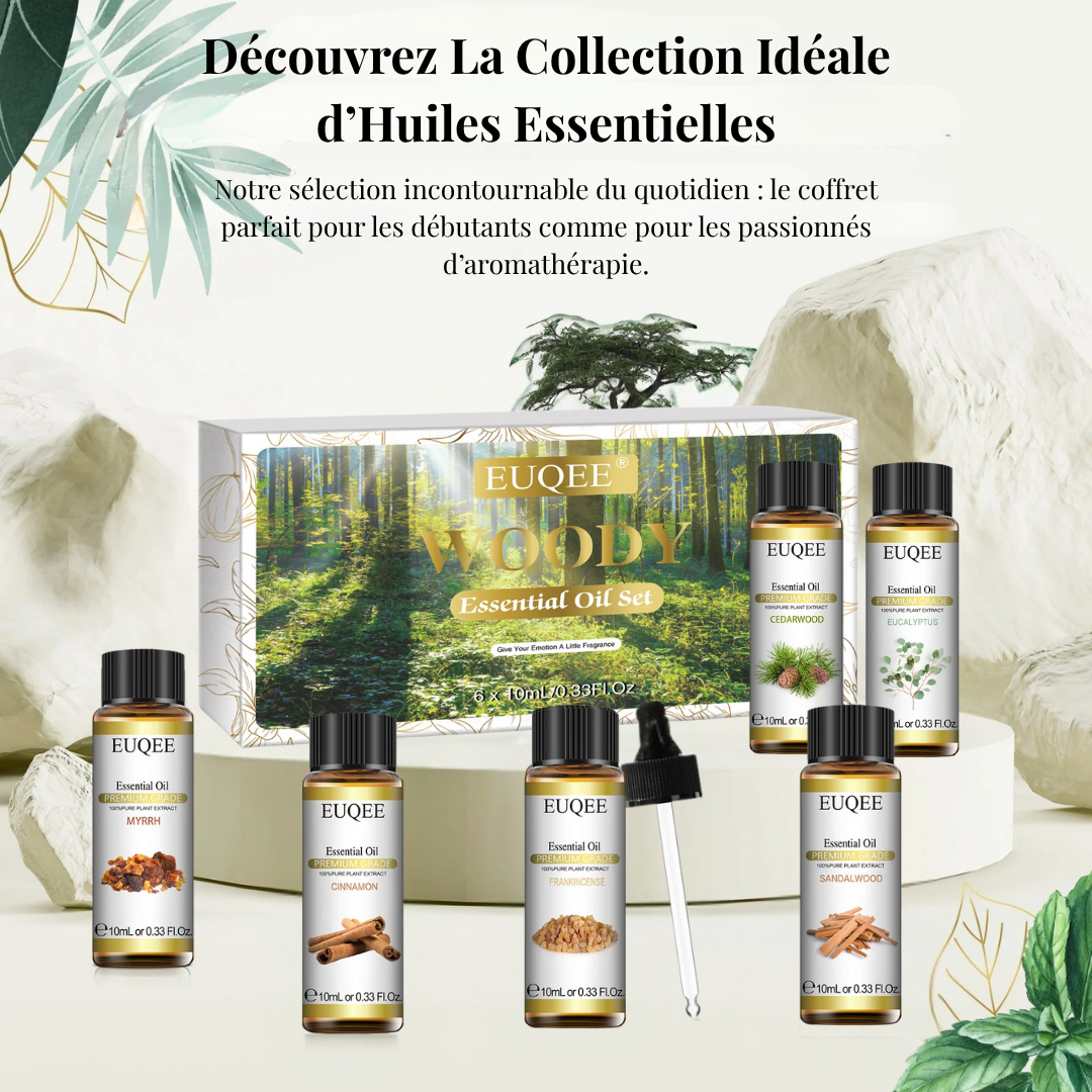 coffret huiles essentielles, essence boisée, 6x10ml, aromathérapie, notes boisées, relaxation, diffusion, bien-être, Bois de cèdre, Myrrhe, Encens, Bois de santal