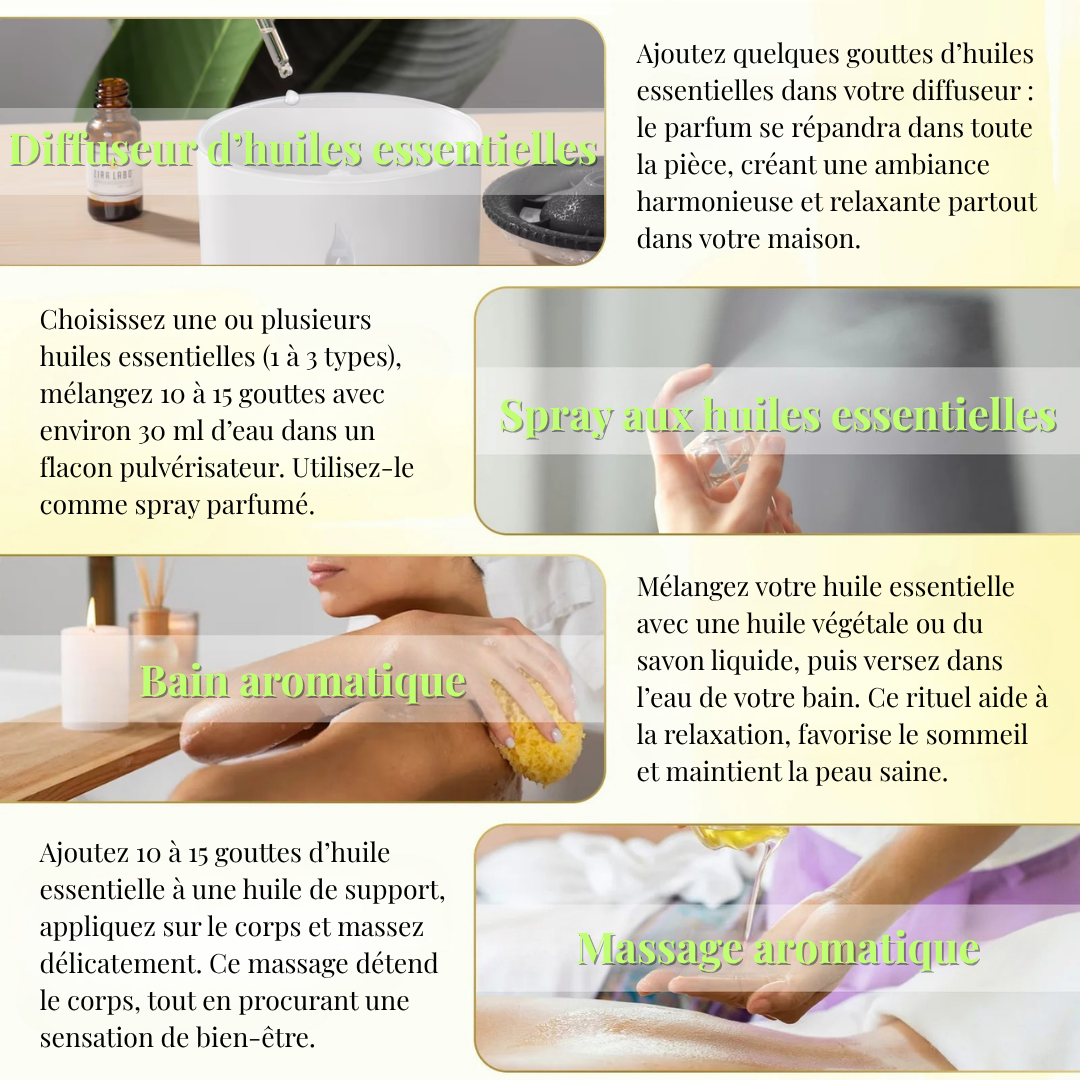 - Utilisez quelques gouttes dans un diffuseur ou sur un galet