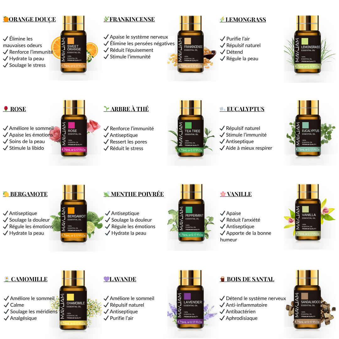 Cannelle, Lavande, Jasmin, Eucalyptus, Vanille, Menthe poivrée, Bois de santal, Encens, Orange douce, Ylang Ylang, Rose, Bergamote, Arbre à thé, Lemongrass, Romarin, Géranium, Citronnelle, Camomille, Sauge sclarée, Patchouli